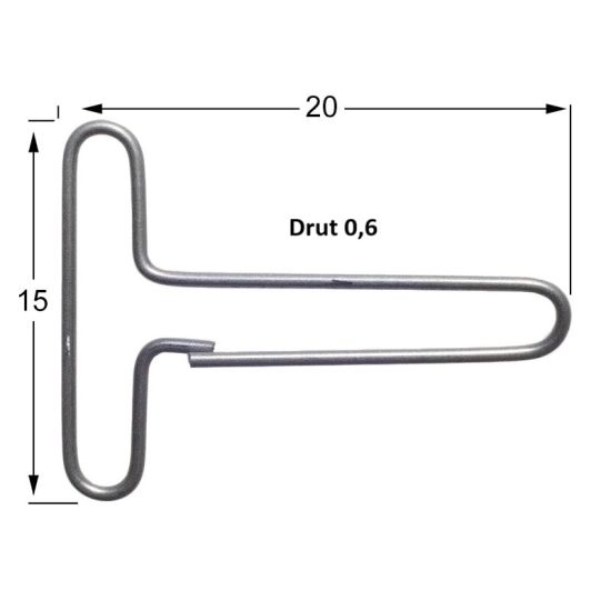 Całkowita długość – 20 mm, wysokość 15 mm, drut nierdzewny – fi 0,6 mm.